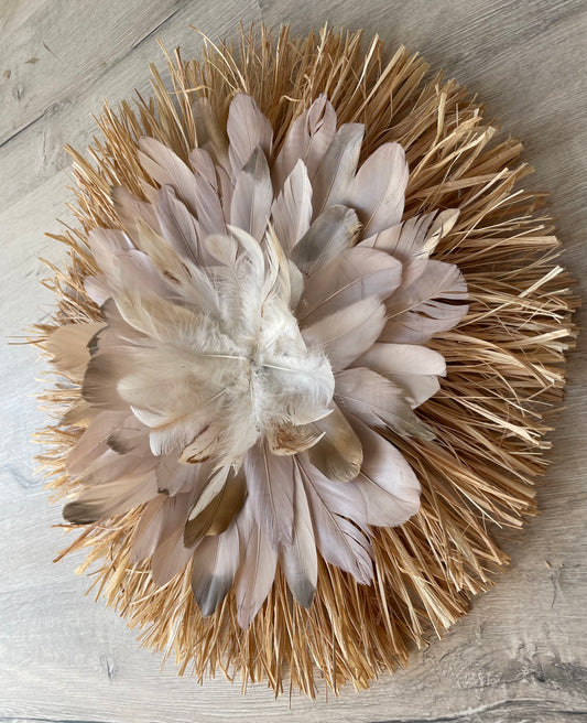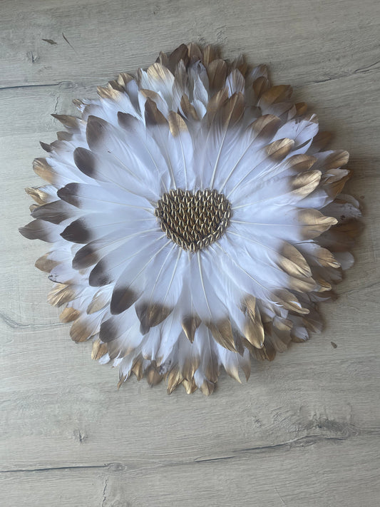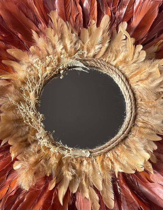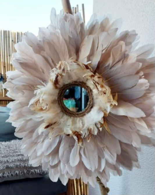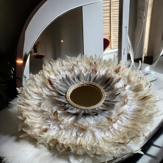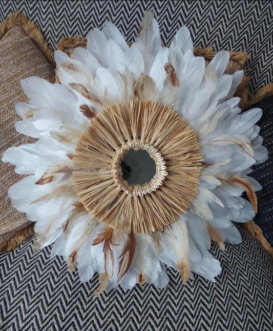 Jujuhat « BORA-BORA » en plumes blanches avec miroir et cauris – Décoration murale bohème chic artisanale en raphia
